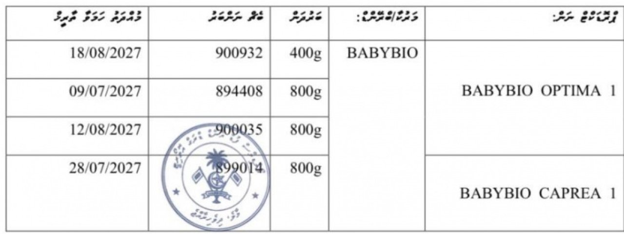 ތުއްތު ކުދީންނަށް ކާންދިނުމަށް ތައްޔާރުކޮށްފައިވާ "ބޭބީ ބަޔޯ" ފޯމިއުލާގެ ބައެއް ބެޗްތަކުން ވިހަ މާއްދާއެއް ފެނިގެން އެ އުފެއްދުން ރާއްޖޭގައި ވިއްކުމާއި ބޭނުންކުރުން މޯލްޑިވްސް ފުޑް އެންޑް ޑްރަގް އޮތޯރިޓީ (އެމްއެފްޑީއޭ) އިން މަނާކޮށްފި އެވެ.